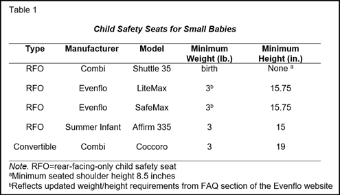 Determining which seat fits by weight is a good first step to narrow selection. Most rear-facing-only (RFO) safety seats allow use by infants beginning at 4 lbs. At the time this article was written, three RFO seats allow use beginning at 3 lbs, and one may be used “from birth.” Larger convertible or all-in-one seats typically allow rear-facing use starting at 5 lbs, though several are available that start at 4 lbs and one allows use beginning at 3 lbs. After disqualifying seats based on weight, minimum height requirements can be used to immediately narrow options. See Table 1 to learn more about child safety seats for small babies.