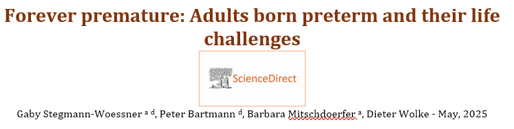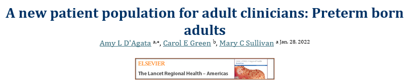 What if a single event could sway health, exercise capacity, learning style, social interactions, and even personal identities–yet individuals had no memory of the event? Adults born preterm are an under-recognized and vulnerable population. Multiple studies of individuals born prematurely, including our 35-year longitudinal study, have found important health concerns that adult healthcare providers should consider in their assessments. Concerns include increased rates of cardiovascular disease, metabolic syndrome, depression, anxiety and attention problems, lower educational attainment and frequency of romantic relationships. A Nordic study of over six million individuals found a linear relationship between gestational age and protection against early adult mortality, with preterm individuals showing 1⋅4 times increased likelihood of early mortality as full-term peers.
