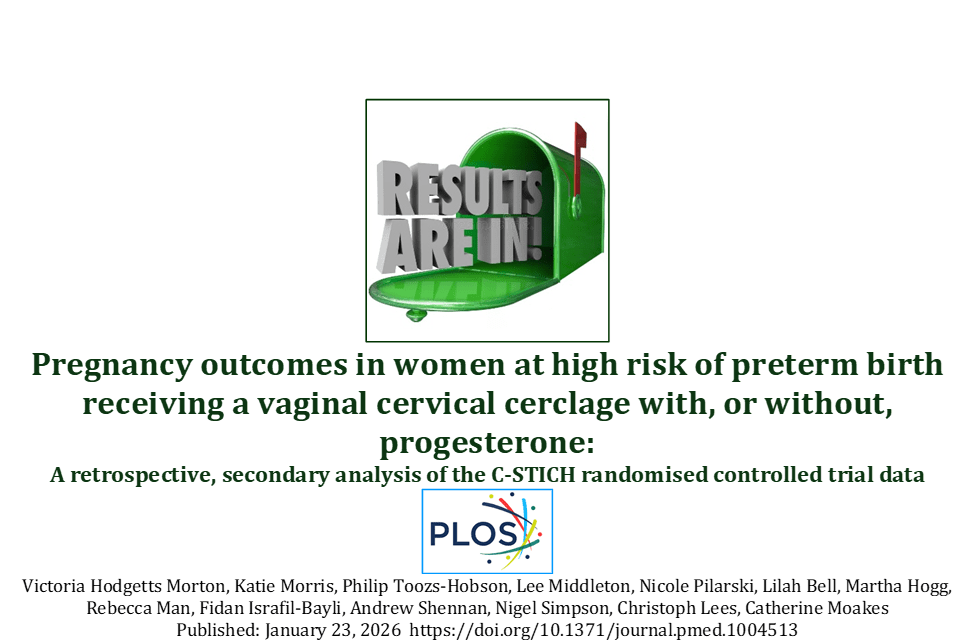 From the 2,048 women recruited to C-STICH, 1943 (95%) women had a vaginal cerclage placed and available progesterone data. Of these, 834 (43%) women received progesterone and 1,109 (57%) did not receive progesterone. In women with primary outcome data available, in our predefined analysis pregnancy loss occurred in 49 (5.9%) of 832 women who received progesterone and 91 (8.3%) of 1,103 women who did not receive progesterone (adjusted* risk ratio 0.70 (95% confidence interval (CI) [0.50, 0.99]); adjusted risk difference −0.02 (95% CI [−0.04, −0.001], *adjusted for indication, obstetric history, surgical technique, and maternal age). Further exploratory analysis excluding women who had termination of pregnancy for foetal anomaly demonstrated a nonsignificant reduction in the risk of pregnancy loss. Key limitations of this study include a non-randomized trial design and unknown confounding relating to variation in progesterone use.