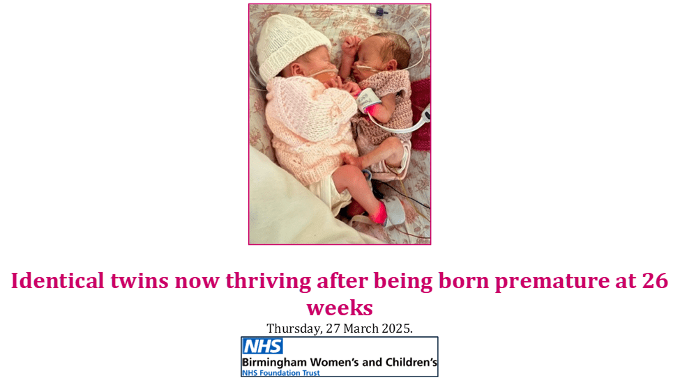 Source:https://bwc.nhs.uk/news/identical-twins-now-thriving-after-being-born-premature-at-26-weeks-14305/